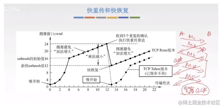 快恢复就是不用降低到1,直接降低到新的门限值那里 然后使用拥塞避免算法!!