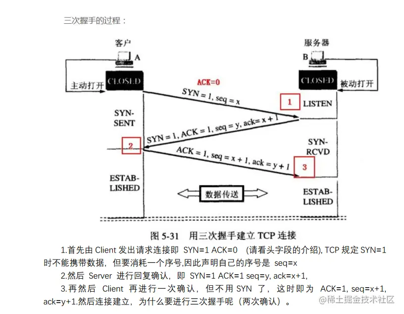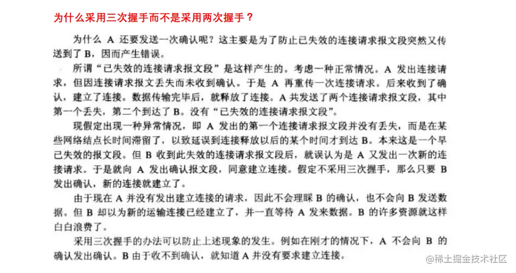 简单总结就是:为了防止 A发送数据过程中,卡了很久,最后又到了,如果只是两次握手,那么B误认为 A要连接,白白等待 浪费资源时间