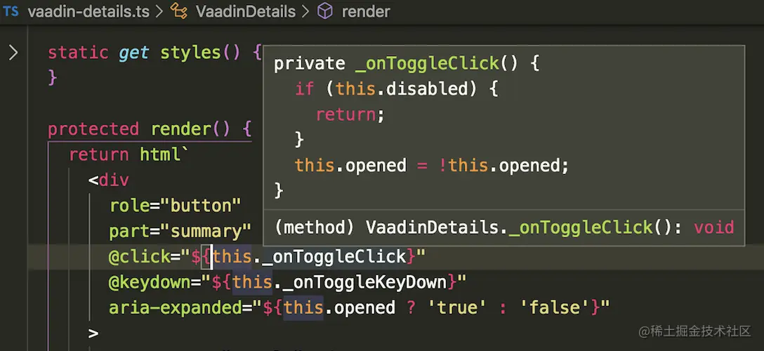 使用TypeScript最大的好处是给前端开发者带来了良好的开发体验。我们也很欣赏DOM API的全面类型定义,以及对lit-html模板的类型检查支持,让我们能够让Vaadin组件更加可靠和类型安全。