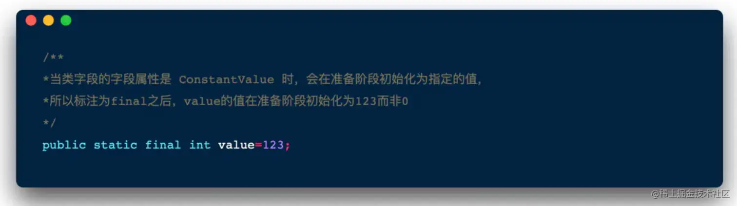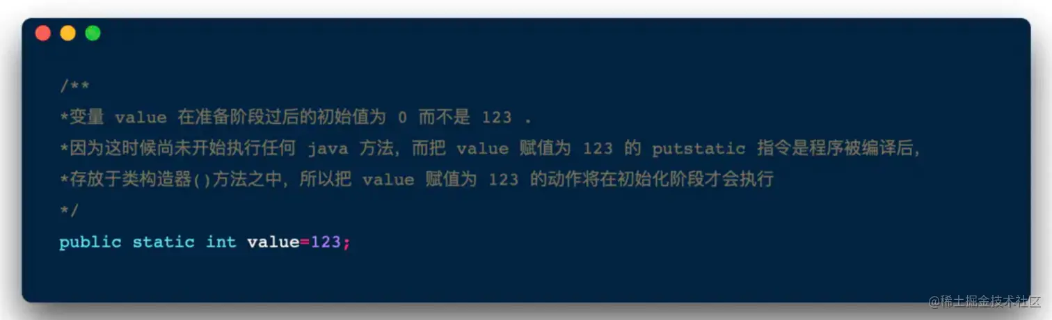 在方法区中给类变量(static修饰)分配内存。然后初始化其值**(对应数据类型的默认值)****,如果类变量是常量<被final修饰>,则直接赋值为该常量值,否则为java类型的默认零值。**实例变量会在对象实例化时随着对象一块分配在Java堆中。