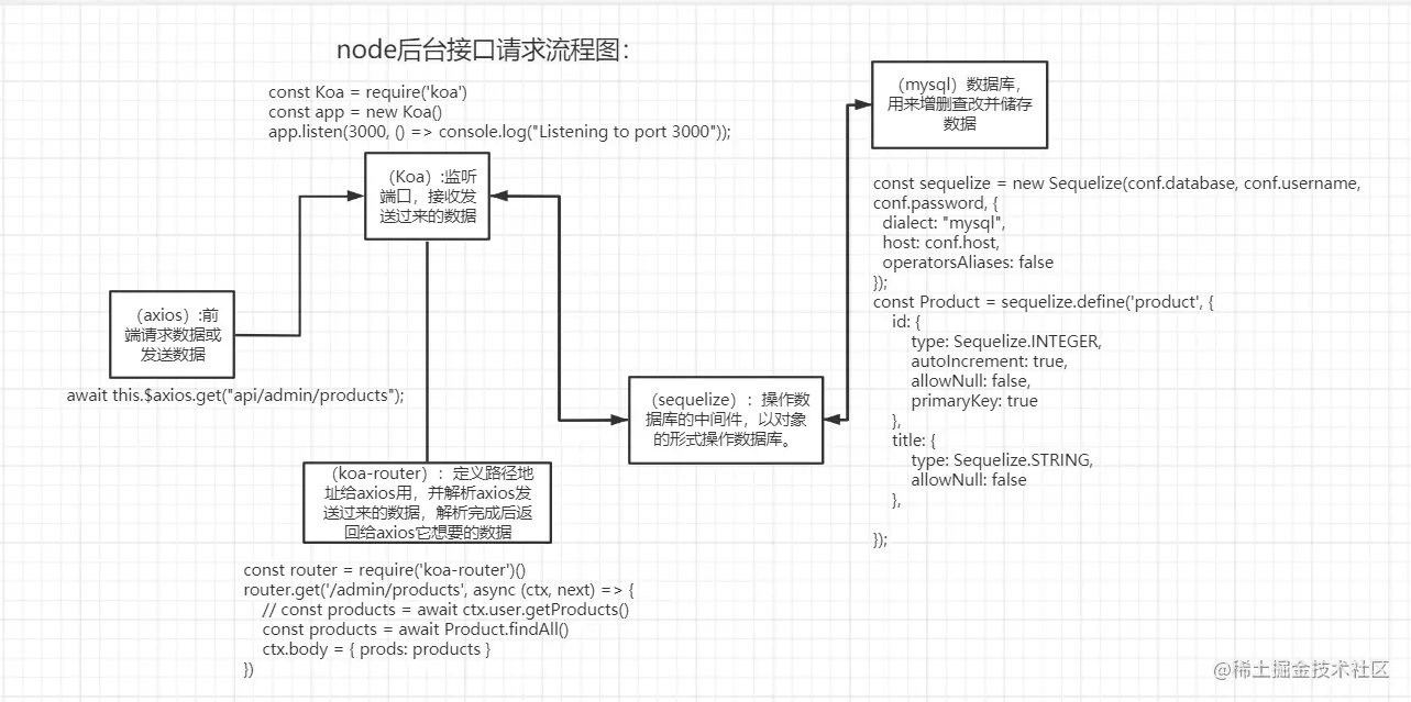 node后台流程图 chenqiwang 2020-09-04 647 阅读1分钟 前端通过axios发起请求获取到后台数据,那么后台是怎么接受数据,怎么处理数据,然后返回数据的呢?最近学习了一点相关知识,整理了一下大概的流程,这个流程中要用到的工具库有哪些,发挥着怎样的作用。