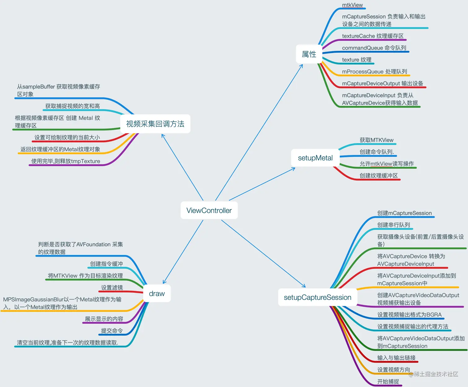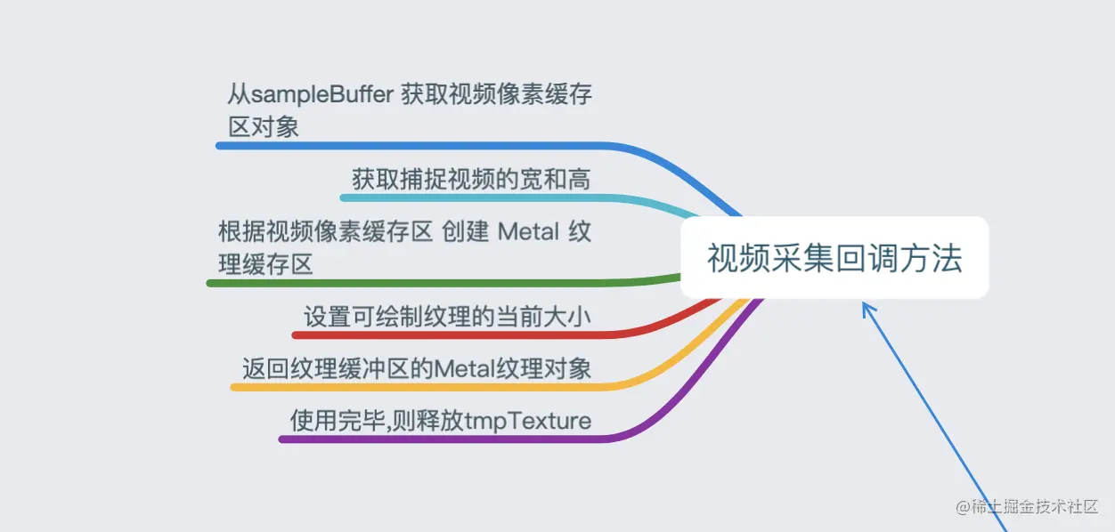 captureOutput:didOutputSampleBuffer:fromConnection:,在该方法中处理采集到的原始视频数据,将其转换为Metal纹理。