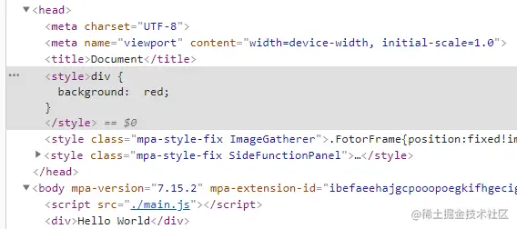 这里新增 module 的配置,使用 style-loader 和 css-loader 来解析导入的 CSS 文件。其中 css-loader 处理的是将导入的 CSS 文件转化为模块供后续 Loader 处理;而 style-loader 则是负责将 CSS 模块的内容在运行时添加到页面的 style 标签中。运行之后可以看到: