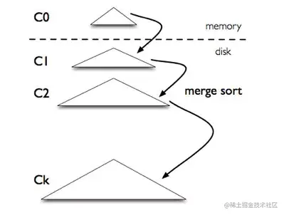 图中的C0代表了缓存在内存中的数据,当内存中的数据达到了一定的阈值后,就会把数据内存中的数据排序后保存到磁盘当中,这就形成了磁盘中C1级别的增量数据(这些数据也是按照主键排序的),这个过程通常被称为转储。当C1级别的数据也达到一定阈值的时候,就会触发另外的一次合并(合并的过程可以认为是一种归并排序的过程),形成C2级别的数据,以此类推,如果这个逐级合并的结构定义了k层的话,那么最后的第k层数据就是最后的基线数据,这个过程通常被称为合并。