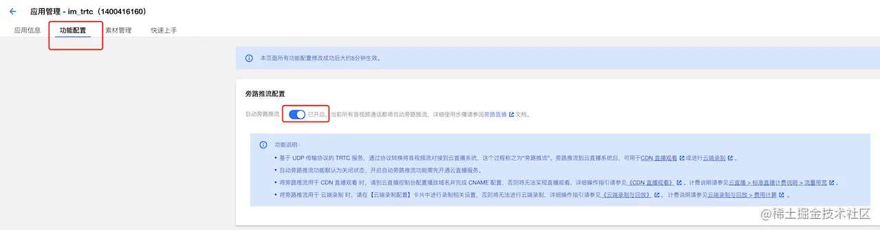 在 腾讯云实时音视频 TRTC 控制台 中创建一个实时音视频应用(此时会自动创建一个 SDKAppID 相同的 IM 应用),取得 SDKAPPID。然后应用管理 -> 功能配置 -> 开启自动旁路推流。开启旁路推流功能后, TRTC 房间里的每一路画面都配备一路对应的播放地址(如果不需要 CDN 直播观看,可略过开启旁路推流的步骤)。