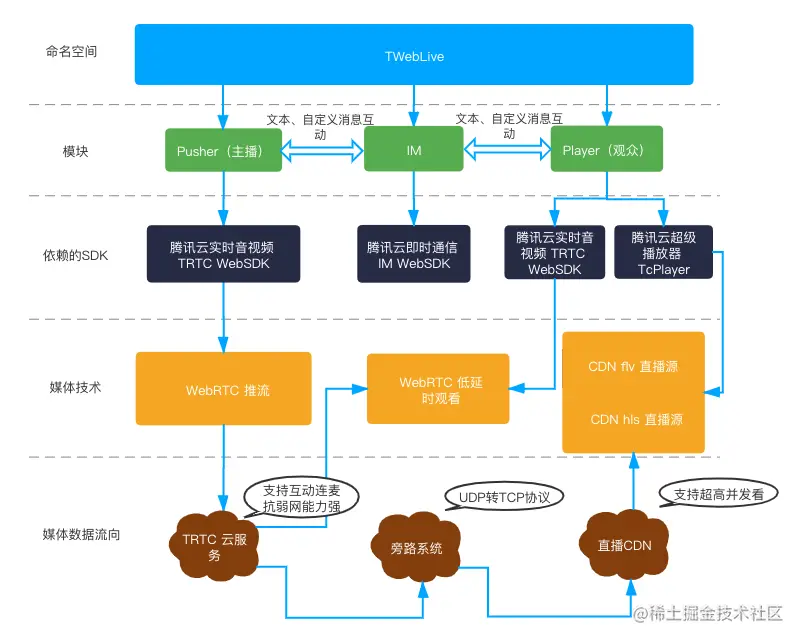 TWebLive,腾讯云 Web 直播互动组件,是腾讯云终端研发团队推出的一个新的 SDK,集成了腾讯云实时音视频 TRTC、腾讯云即时通信 TIM、腾讯云超级播放器 TCPlayer,覆盖了 Web 直播互动场景常见的功能(推流、开/关麦,开/关摄像头,微信分享观看、聊天点赞等等),并封装了简单易用的 API,接入后可快速实现 Web 端推流、拉流以及实时聊天互动功能。