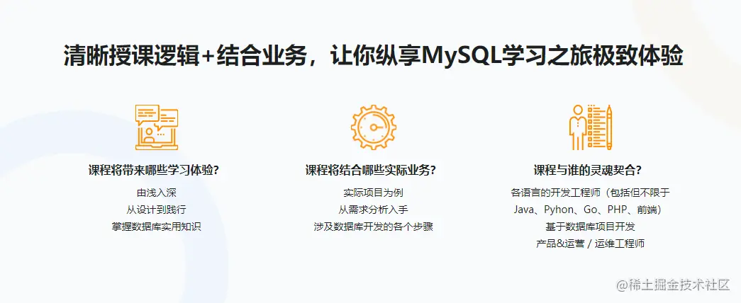 本课程遵循“用户体验至上”的原则,不敢说设计精良,尽善尽美,却也竭尽全力去锻造良好的学习体验。包含三方面,(1)设计之初:遵循“有教无类,教学相长”的原则;(2)学习路线:采用循序渐进的教学模式,带你从了解到熟悉,到掌握,到精通,最后到深谙;(3)学习内容:课程遵循前沿性,以当前最新企业主流的MySQL8.0版本为内容。以“实用”为课程最高宗旨,带你搞定工作中SQL优化 痛点问题,最终的目的是:助力个人能力的快速提升,最终服务工作所需,助你占据不可替代的一席之地。