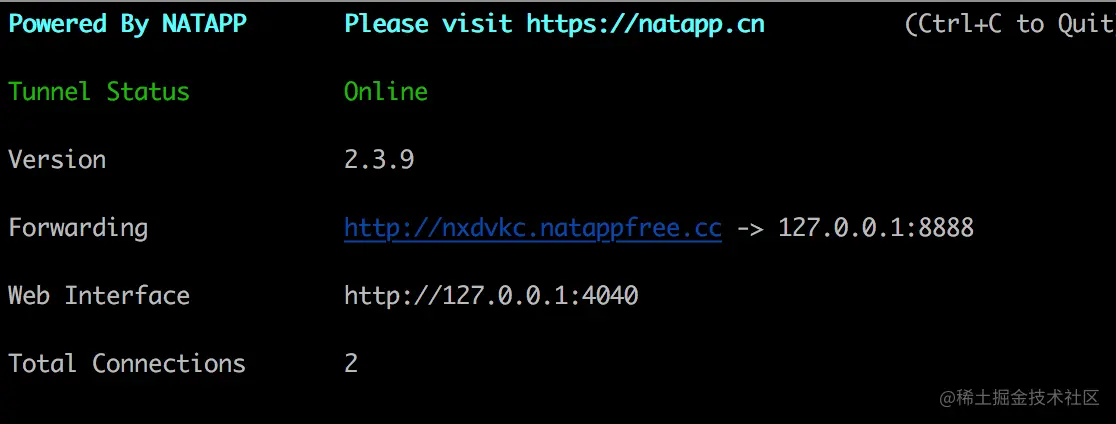 当映射成功后会出现一个页面,上面有外网地址:nxdvkc.natappfree.cc