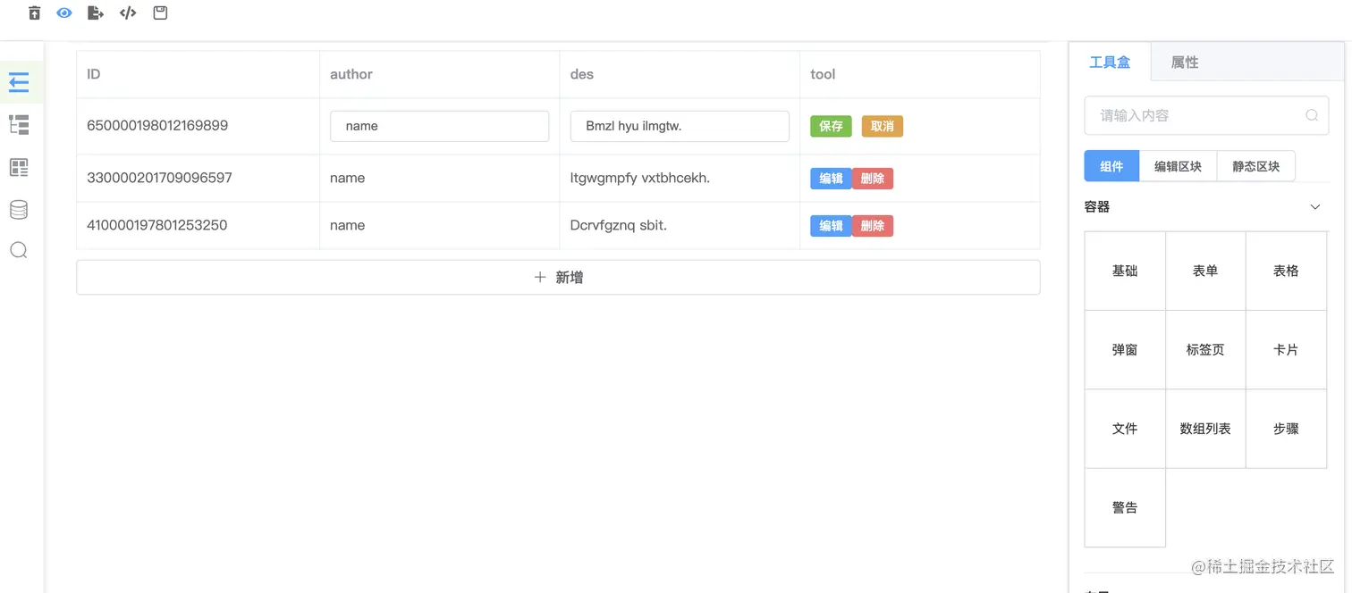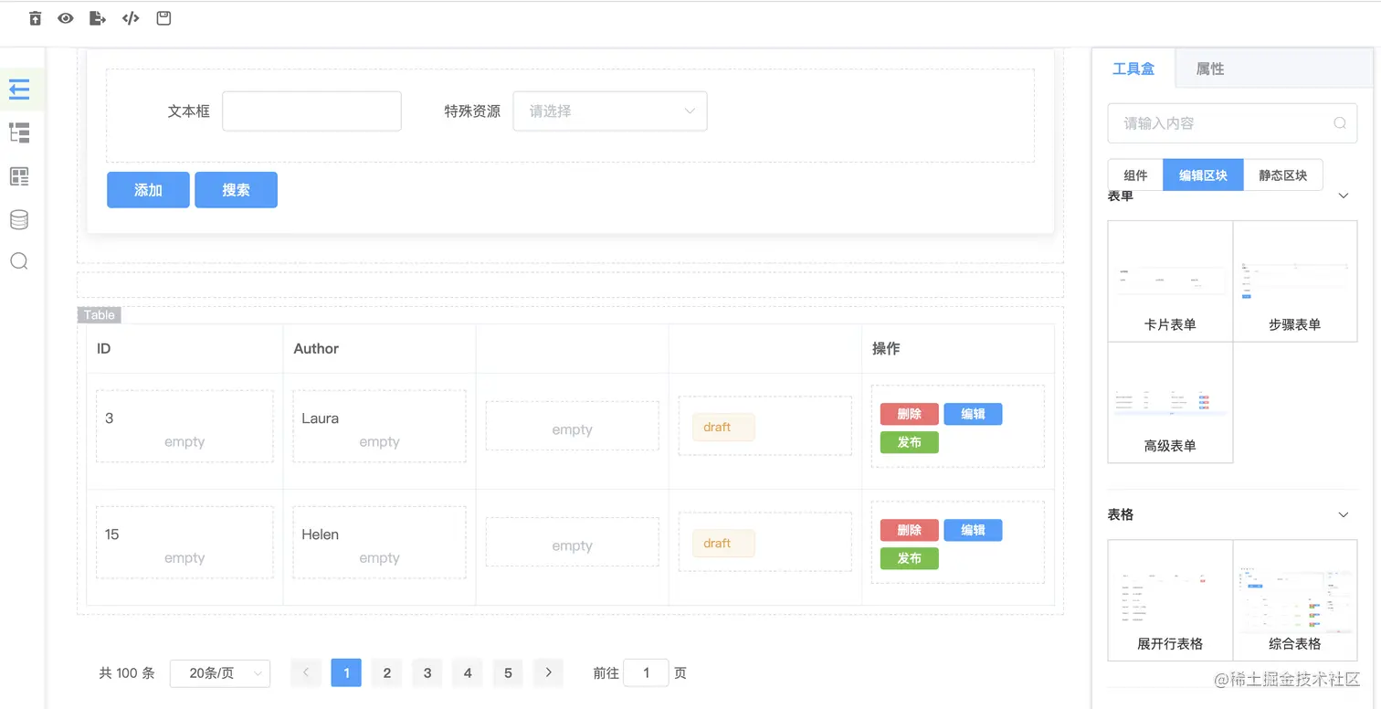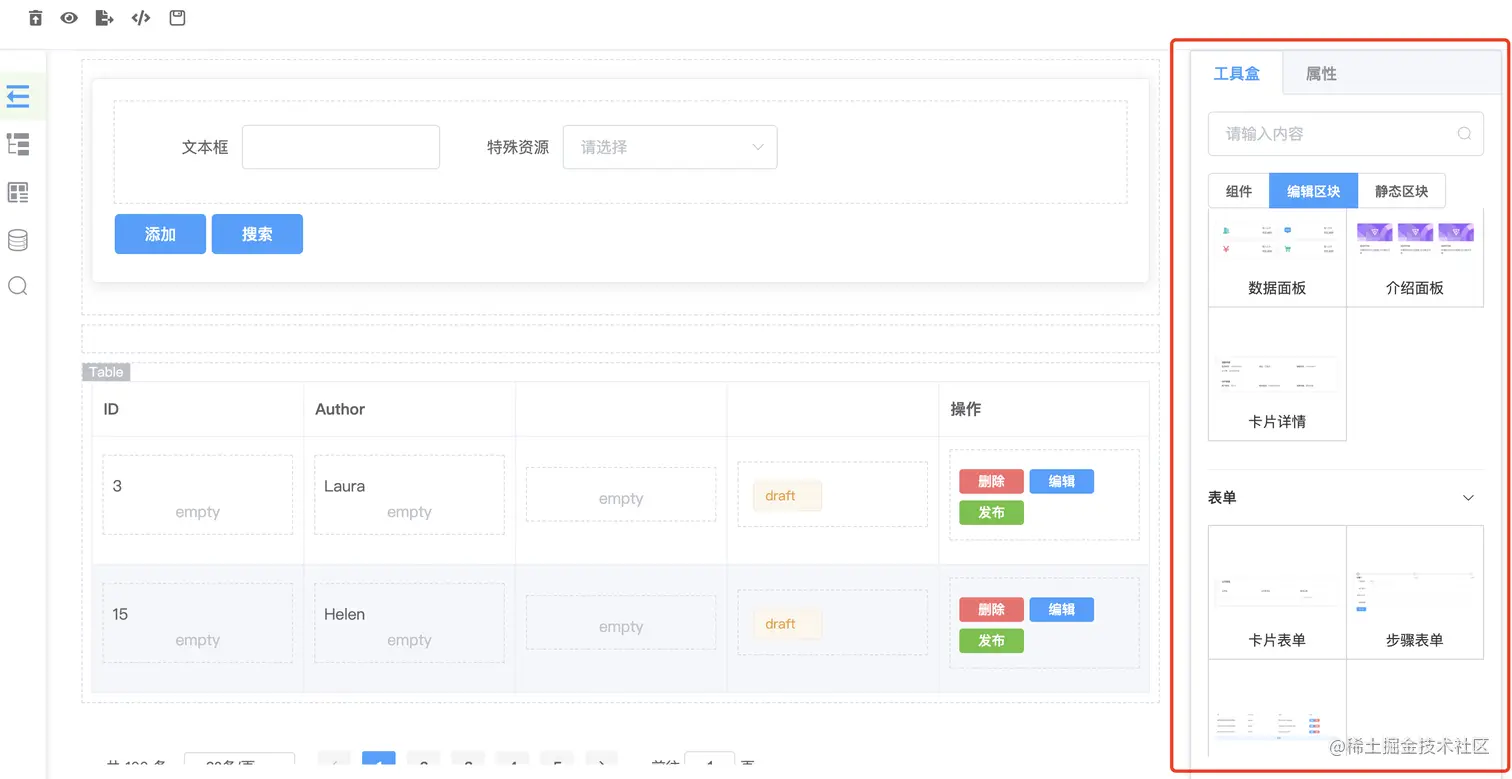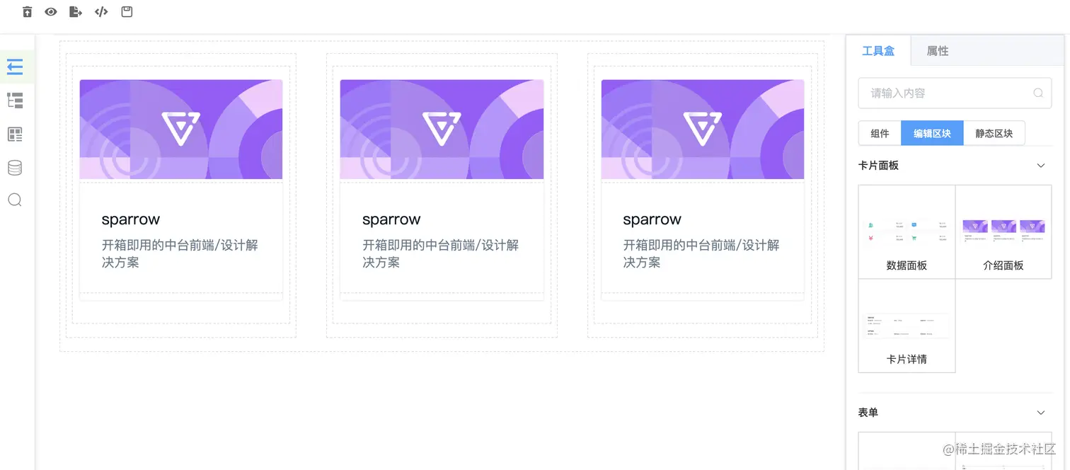 编辑区块是为sparrow-js的核心目标提效量身定做的,sparrow本身有基本可视化搭建的能力,但是通用的可视化方案提效能力有限,可能只是基础组件的拼接,操作繁杂,输出的代码更侧重UI层面的代码。前端开发由UI部分和逻辑部分组成,UI部分通过基础组件的可视化搭建就可以完成,逻辑部分比如表单上面的删除、编辑、上下线等操作,这些带有特定功能逻辑的代码需找到个介质来承载,编辑区块就是为了承载基础UI和特定逻辑功能的容器。