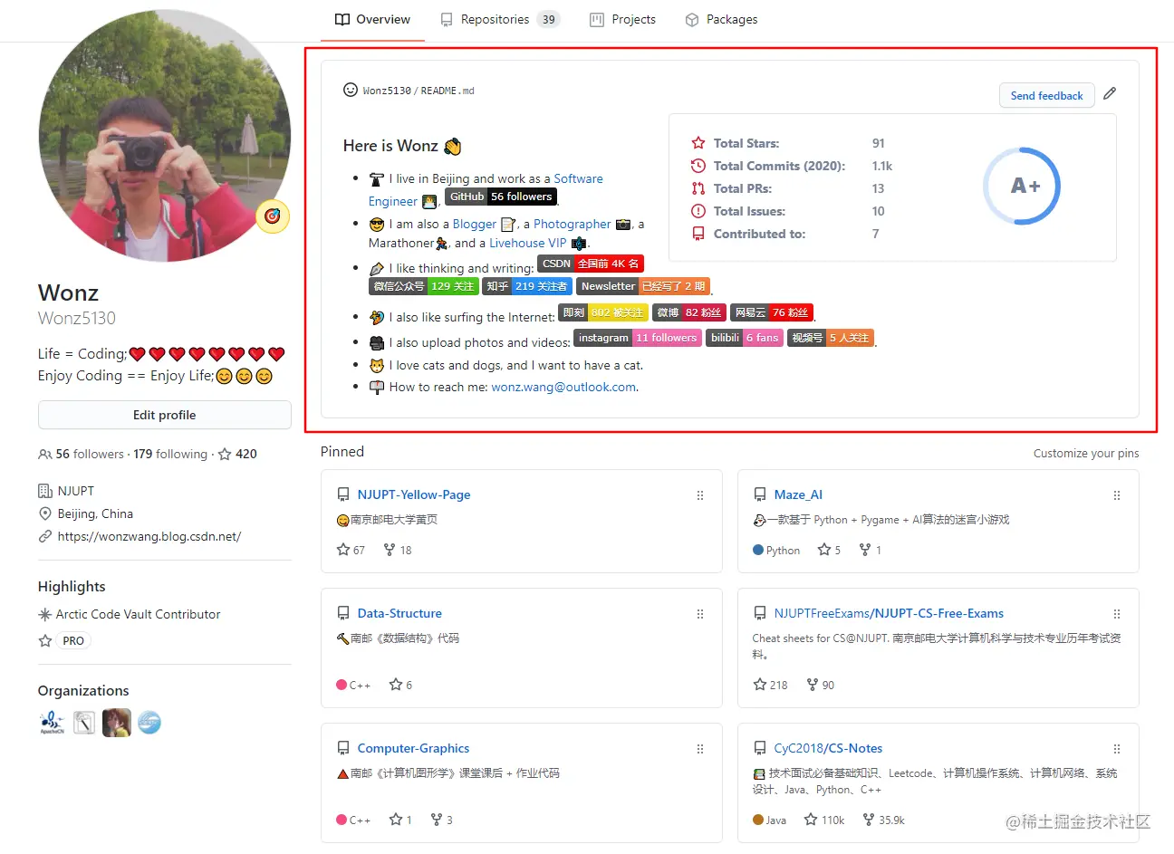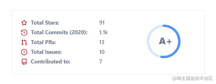 在浏览 GitHub 项目的时候,经常可以发现下图所示的 数据牌 展示。我们完全可以使用 数据牌 进行美化自己的 profile。