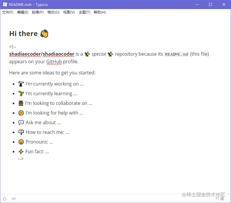 用 Typora 打开创建完的这个项目下的 README 文件,可以看到如下界面。