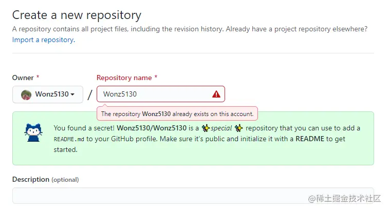 首先,在 GitHub 中创建和账号同名的一个 repository,就会发现这个小彩蛋。