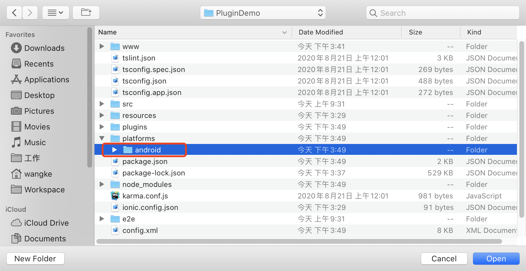 在文章的一开始就已经介绍过关于 plugin.xml 中标签的作用。这里要强调 source-file 标签中 src 属性的值为文件在插件包中的路径,但 target-dir 就一定需要严格按照之前我们在Android 层实现功能的目录结构来添加。