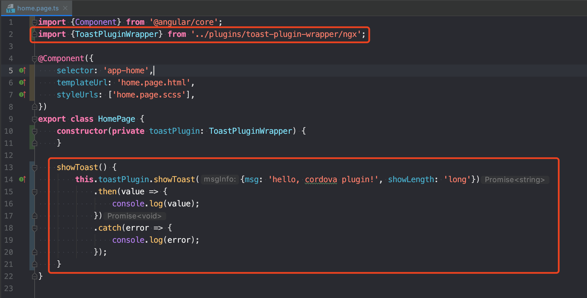import { Injectable } from '@angular/core'; import { Plugin, Cordova, CordovaProperty, CordovaInstance, InstanceProperty, IonicNativePlugin } from '@ionic-native/core'; import { Observable } from 'rxjs'; @Plugin({ pluginName: 'ToastPluginWrapper', plugin: 'cordova-plugin-toast', pluginRef: 'cordova.plugins.ToastPlugin', platforms: ['Android'] }) @Injectable() export class ToastPluginWrapper extends IonicNativePlugin { @Cordova() showToast(msgInfo: MsgInfo): Promise<string> { return; } } export interface MsgInfo { msg: string; showLength: string; }⚠️ 注意 index.ts 文件中声明插件方法的返回值的类型需要根据 Android 层实现的插件功能是要向前端发送一次消息还是多次。