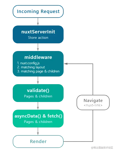 validate执行的时候对客户端携带的参数进行校验; asyncData在渲染组件前向服务端获取数据,把请求到的数据合并到Vue中的data中;render页面渲染,内部跳转<nuxt-link>继续循环执行。