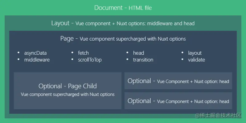 页面组件就是 Vue 组件,在pages存放只不过 Nuxt.js 为这些组件添加了一些特殊的配置项 给首页添加标题和meta等,最重要的一个键, 支持asyncData 异步数据处理,另外该方法的第一个参数为当前页面组件的 上下文对象。