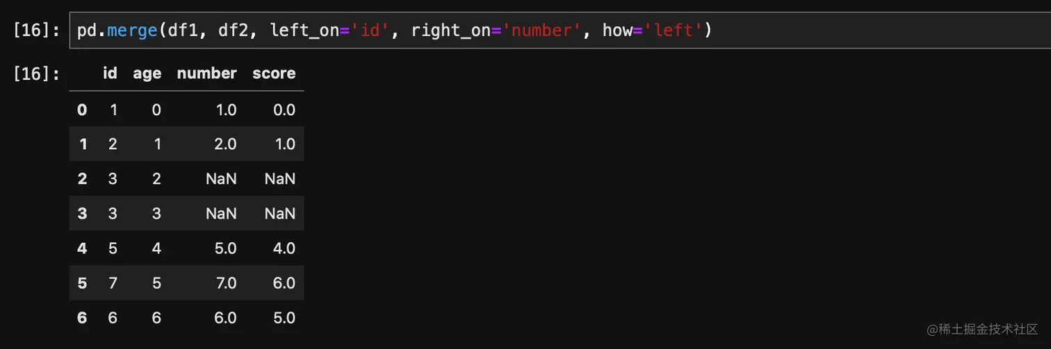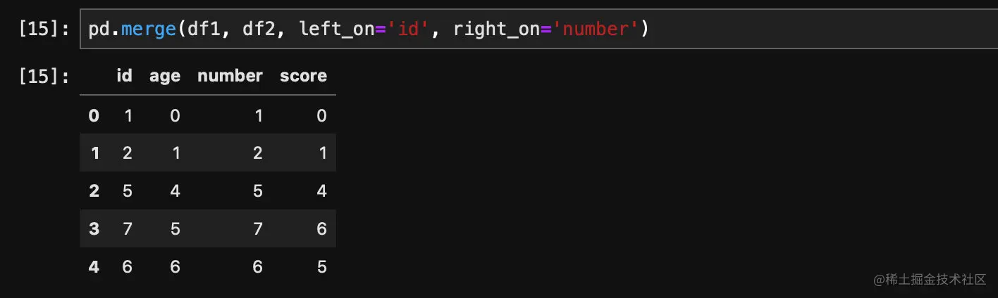 如果需要根据多列关联,我们也可以传入一个数组。但假如两个dataframe当中的列名不一致怎么办,比如这两个dataframe当中的一列叫做id,一列叫做number,该怎么完成join呢?