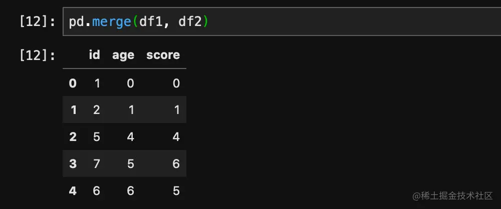 我们可以看到这两个dataframe当中都有id这个字段,如果我们想要将它们根据id关联起来,我们可以用pd.merge函数完成: