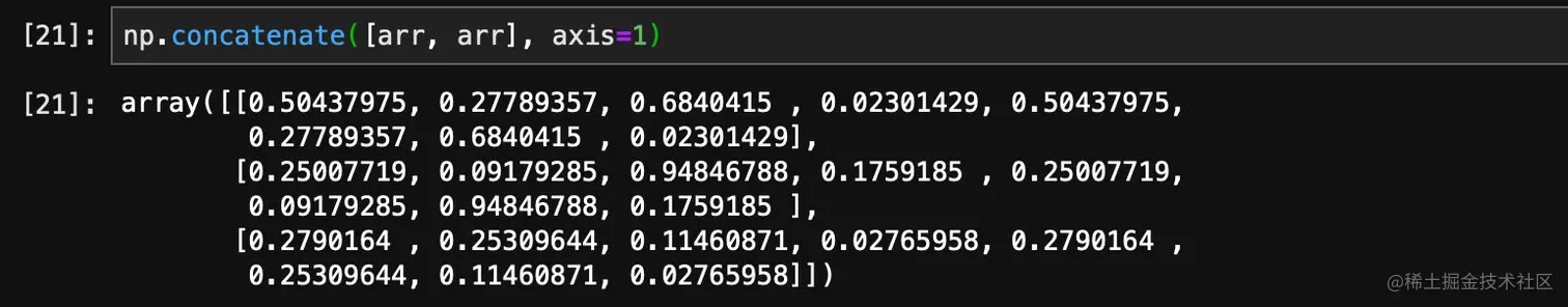 之后呢,我们可以用concatenate函数把这个数组横着拼或者是竖着拼,默认是竖着拼: