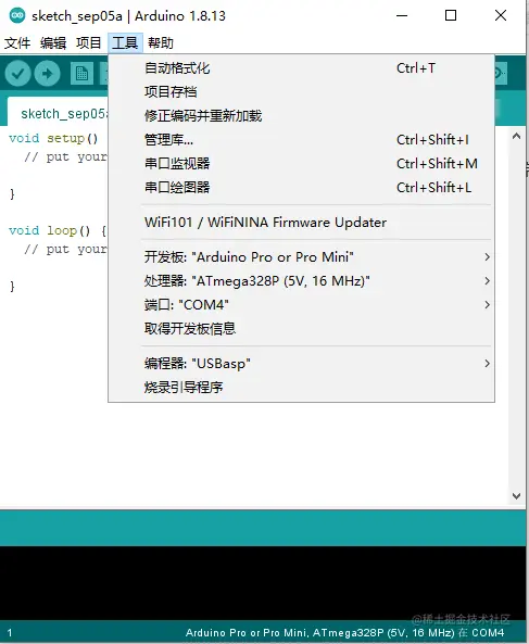 打开Arduino,点击工具,分别将开发板、处理器、编程器选为下图所示,并选好端口COM号,点击烧录引导程序。