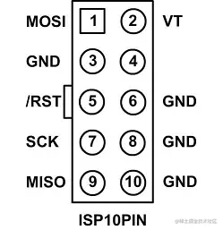 OSD上,以J1下方方形引脚为1号引脚(MISO)连接下载器9号引脚,VCC连接下载器2号引脚,GND连接下载器10号引脚,SCK、RST和MOSI分别连接对应。