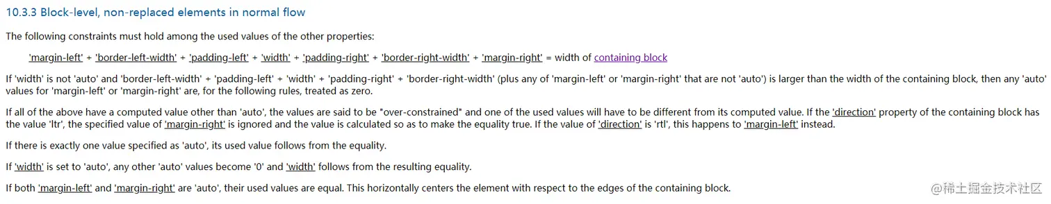 规范中说道:'margin-left' + 'border-left-width' + 'padding-left' + 'width' + 'padding-right' + 'border-right-width' + 'margin-right' = 包含块的宽度