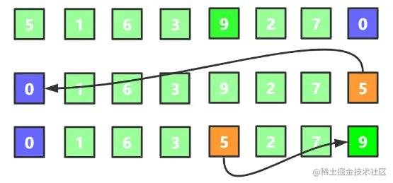 以新的无序数列 {5,1,6,3,9,2,7,0}为例,按照上面的分析,初始状态如下: