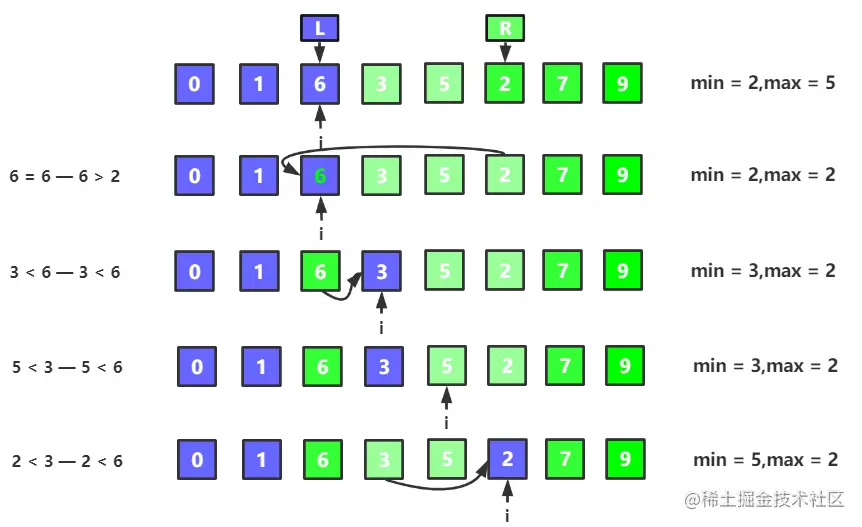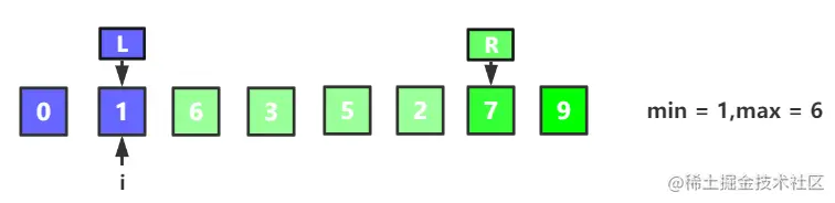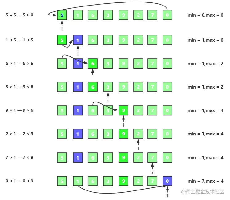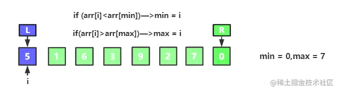 交换最值,将最小值放到arr[left],最大值放到arr[right],同时left++,right--;准备下一轮循环,第一轮结果如下: