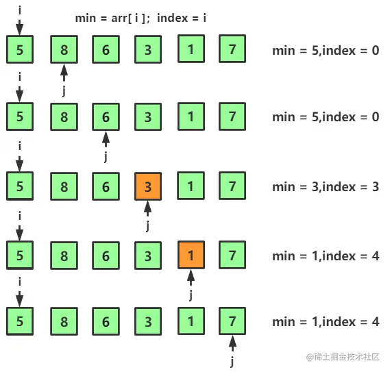 这里其实有可能出现默认的最小值其实就是真正的最小值,所以一轮内层循环下来,是没有交换数据,可以添加哨兵,如果没有找到最小值,就不进行值的交换,减少交换次数。