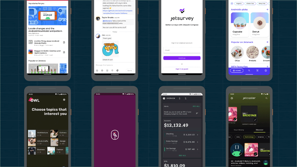要开始使用 Jetpack Compose,请参阅 Compose 教程 并 进行设置。或者直接进入 示例应用 并在 "Compose by Example" 中浏览这些应用: