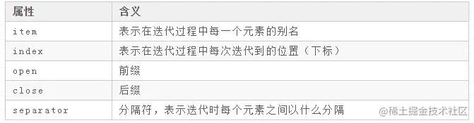 foreach 元素的功能非常强大,它允许你指定一个集合,声明可以在元素体内使用的集合项(item)和索引(index)变量。它也允许你指定开头与结尾的字符串以及集合项迭代之间的分隔符。这个元素也不会错误地添加多余的分隔符
