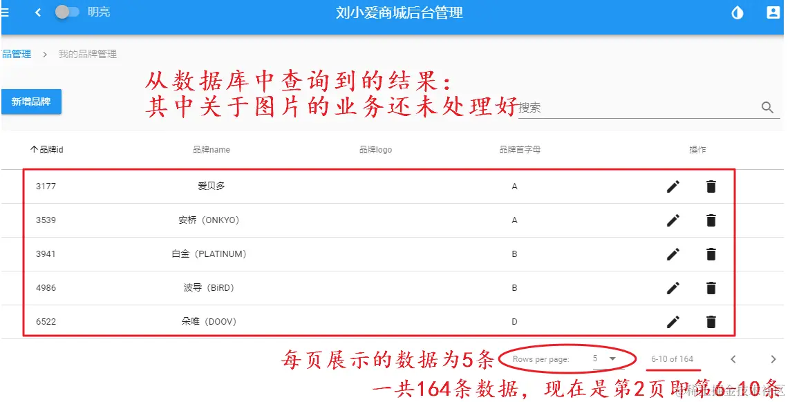- total即总记录数,数据库中一共查到了164条品牌数据。