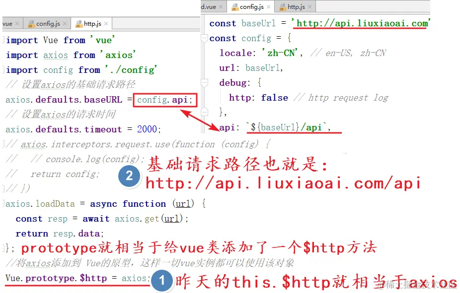 就相当于给Vue这个类增加了一个$http方法,对应的就是axios,昨天发送请求时使用的this.$http其实就相当于这里的axios。