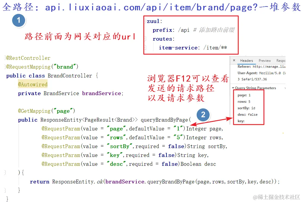 注解@RequestMapping和@GetMapping确定其请求路径,当然全路径中还包括网关对应的域名以及配置的路由。