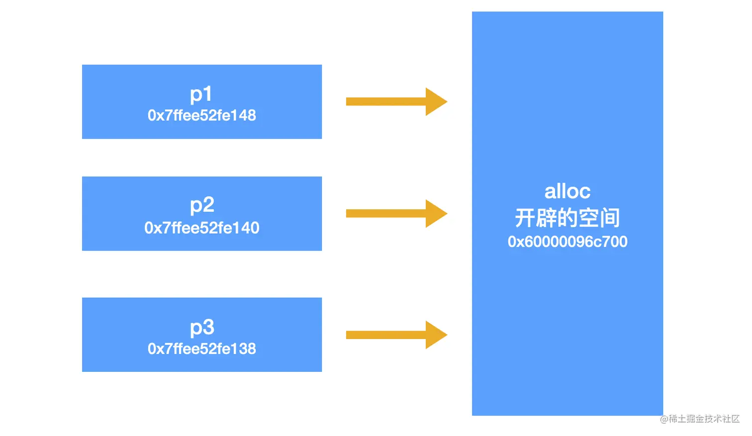 由上图我们看到,p1、p2、p3所指向的内存空间都是相同的,也就说明,只有