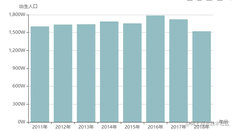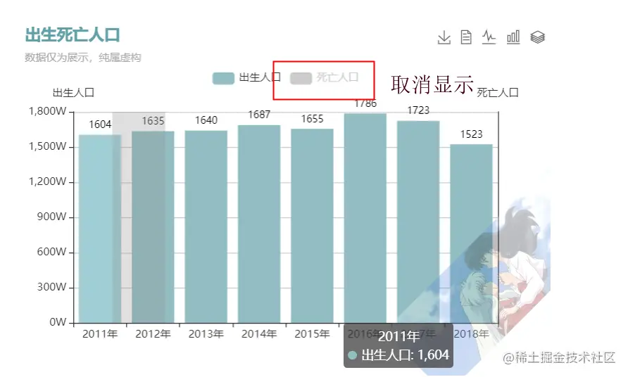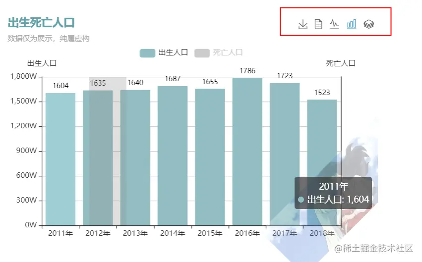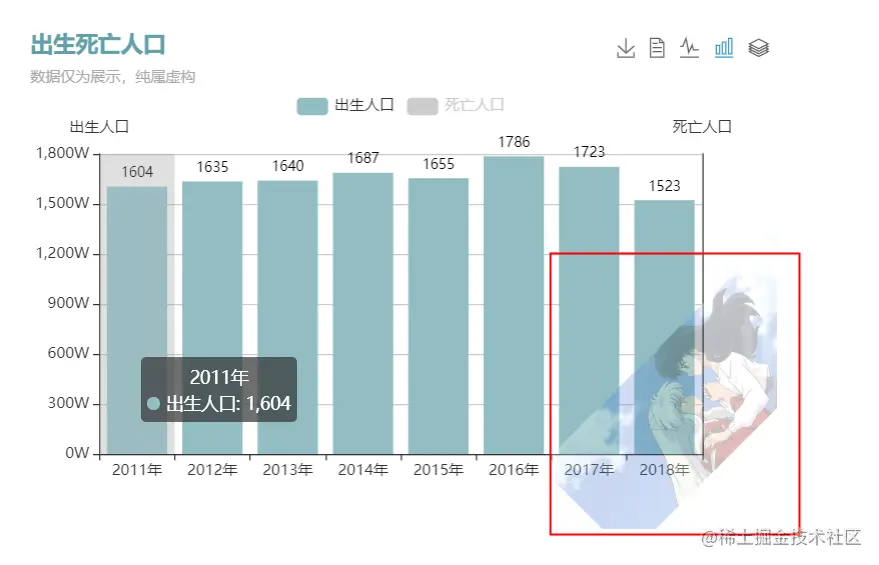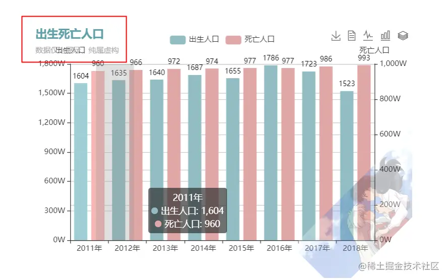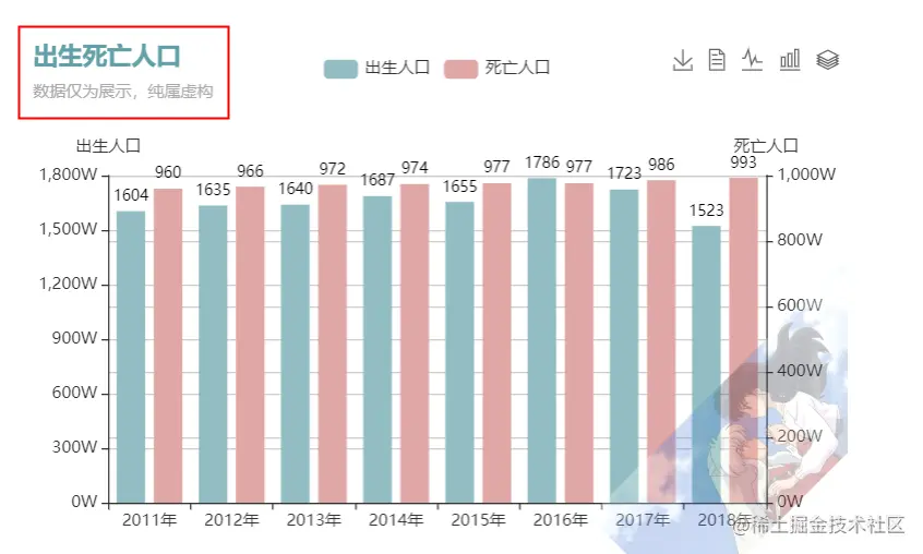 title: { text: '出生死亡人口', subtext: '数据仅为展示,纯属虚构', textStyle: {// 主标题文本样式 color:'#61a0a8' }},