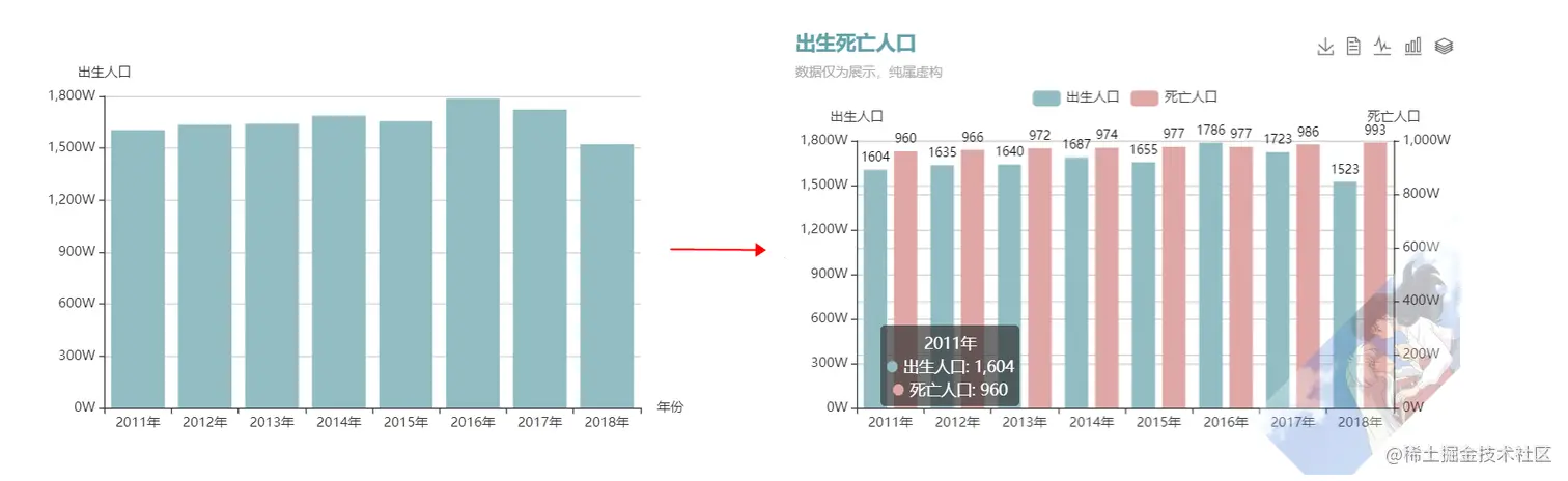 series: [ { data: y1Data, type: 'bar', color: '#91BDC2', name: '出生人口', itemStyle: { normal : { label : { show : true, // 开启显示 position : 'top', // 在上方显示 textStyle : { // 数值样式 color : 'black', fontSize : 11 } } } } }, { data: y2Data, type: 'bar', color: '#E0A7A6', yAxisIndex : 1, name: '死亡人口', itemStyle: { normal : { label : { show : true, // 开启显示 position : 'top', // 在上方显示 textStyle : { // 数值样式 color : 'black', fontSize : 11 } } } } }]