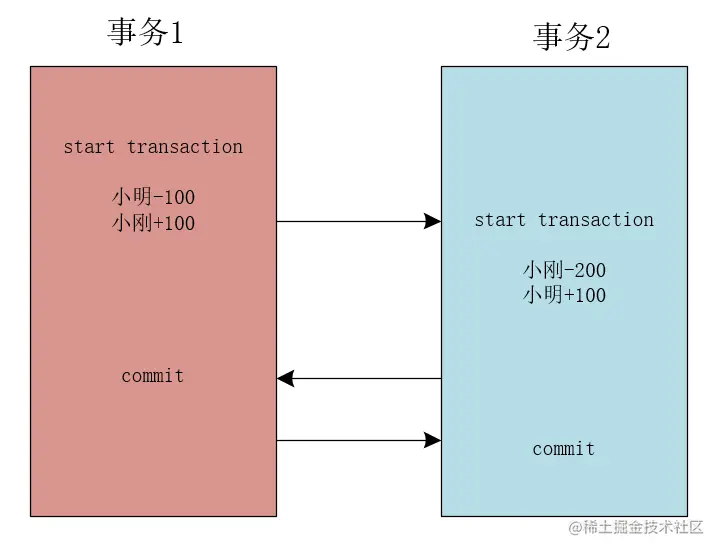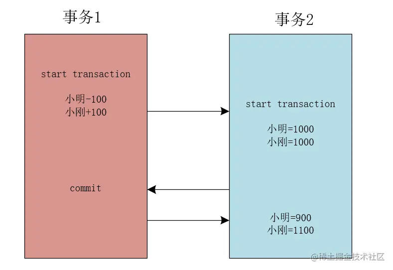 例如,在事务T1中执行小明为小刚转账100元的操作,在事务未提交之前,在事务T2中读取的数据还是小明为1000元,小刚为1000元。待事务T1提交后,事务T2中读取的数据为小明900元,小刚1100元。如下图所示。