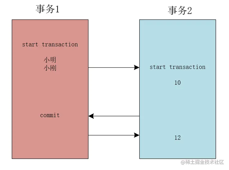 例如,在事务T1中插入两条分别为小明和小刚的数据,在事务提交之前,事务T2中读取的数据记录为10,随后事务T1提交,则在事务T2中读取的记录为12,如下所示。