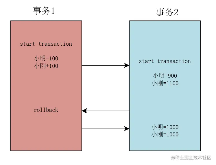 例如:在事务T1中,小明为小刚转账100元,在转账的过程中,事务未提交或者未回滚时,此时事务T2读取到了事务T1未提交的内容,也就是说在事务T2中读取到了小明900元,小刚1100元的记录。可以用下图表示。