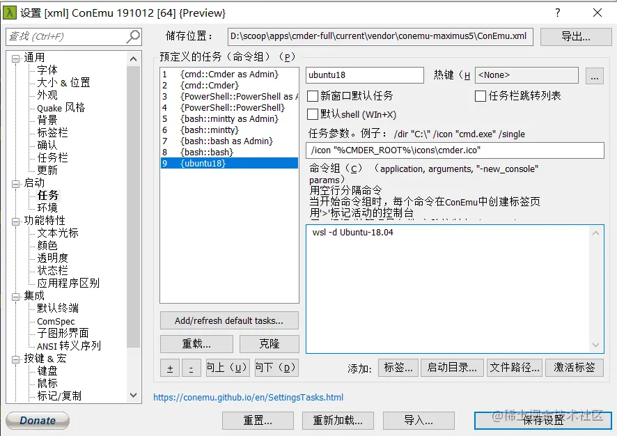 电脑安装的wsl2跟ubuntu18.04我们在Cmder配置一个新的任务叫ubuntu18,下次即可以使用此任务打开wsl2容器中的ubuntu了。想折腾还可以在ubuntu中装上oh-my-zsh。