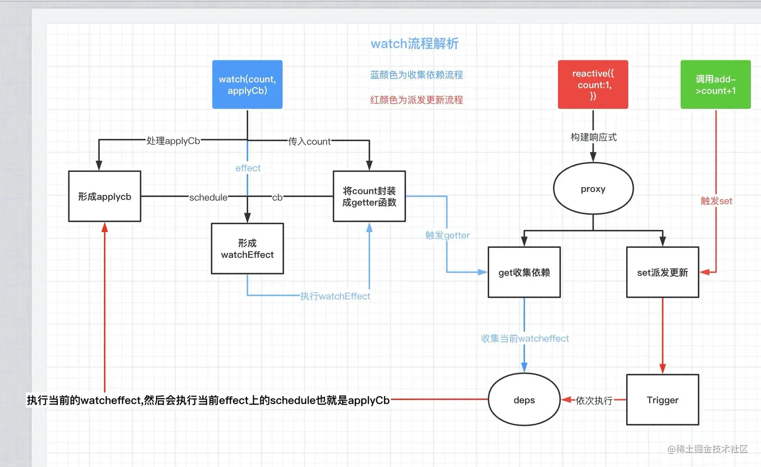 如上所示,当我们点击按钮的时候 ,触发 state.count++ , watch监听函数applyCb就会触发,打印出新的count ,那么我们把整个流程,结合这个例子做一个图解。