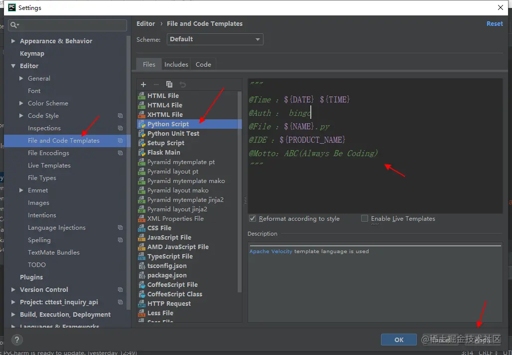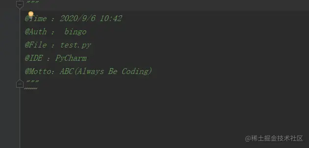 pycharm在文件中设置签名信息 bingo_tsai 2020-09-06 486 阅读1分钟 1.背景描述 在写python文件时,我们需要在文件的开头,标注一些信息,比如,这个文件的作者是谁,是什么时候创建的,作用是什么。 由于一个项目(或称工程)中,文件数量众多,因此,我们可以通过开发工具设置统一的签名模板。 2.操作方法 我们可以借助pycharm来进行配置,操作步骤如下: 3.效果验证 配置好后,效果如下: