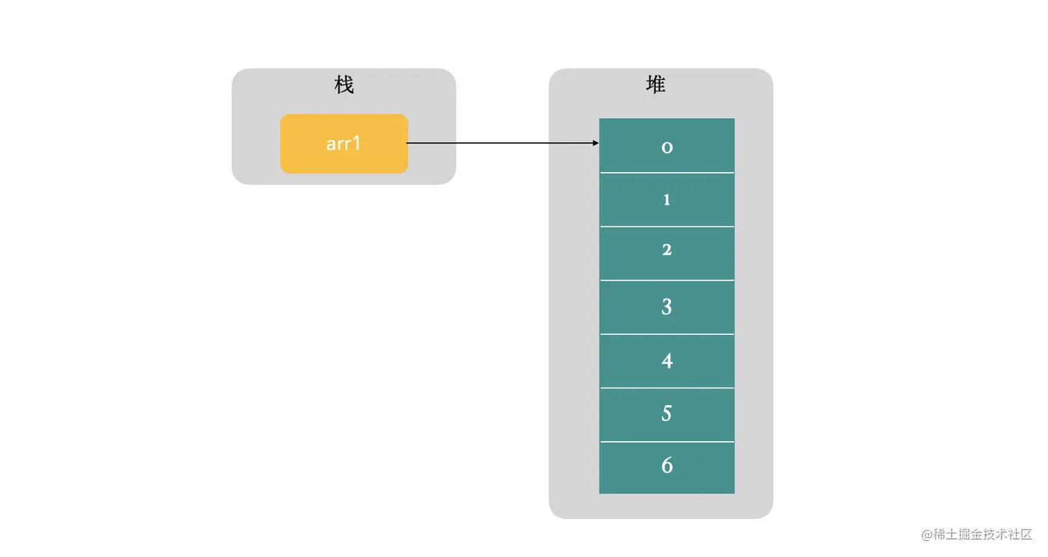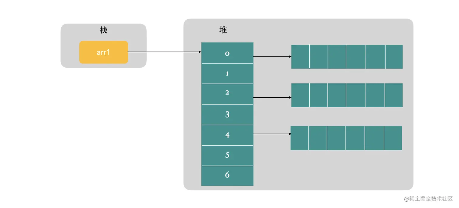 所以对于一维数组来说,就是如下的结构,栈中变量保存指向数组实例的引用。