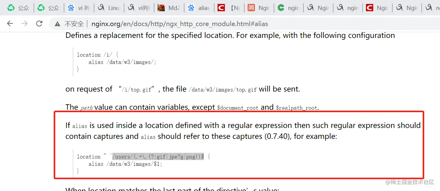 alias在使用正则匹配时,必须捕捉要匹配的内容并在指定的内容处使用,按照个人意思的理解就是正则表达式一定要匹配到内容,然后再alias中引用,不知道是否理解有误不??