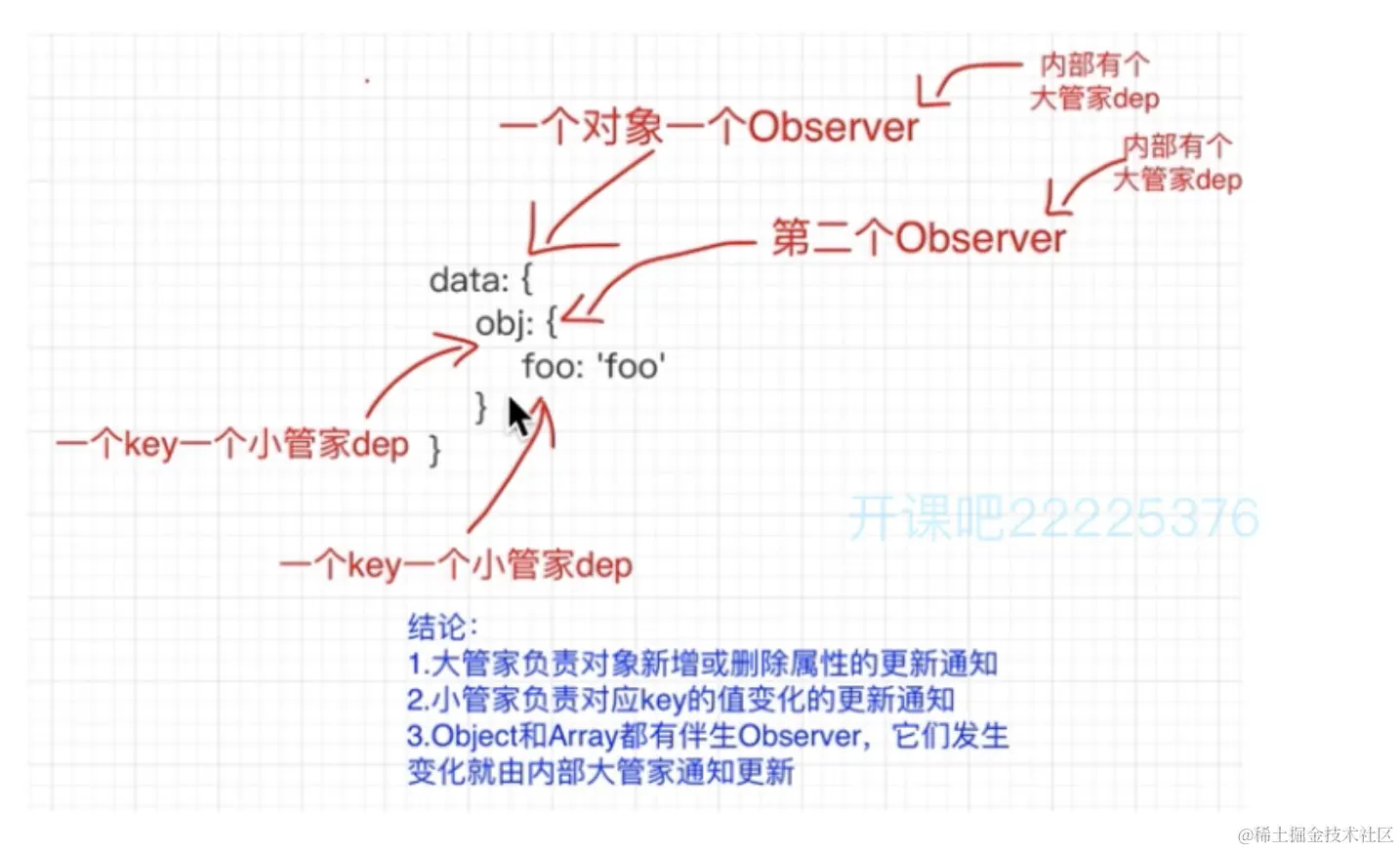 - 创建大管家childob.dep,和对象是一一对应的。监听对象动态删除,增加属性,负责通知,如果存在__ob__就代表已经做过响应