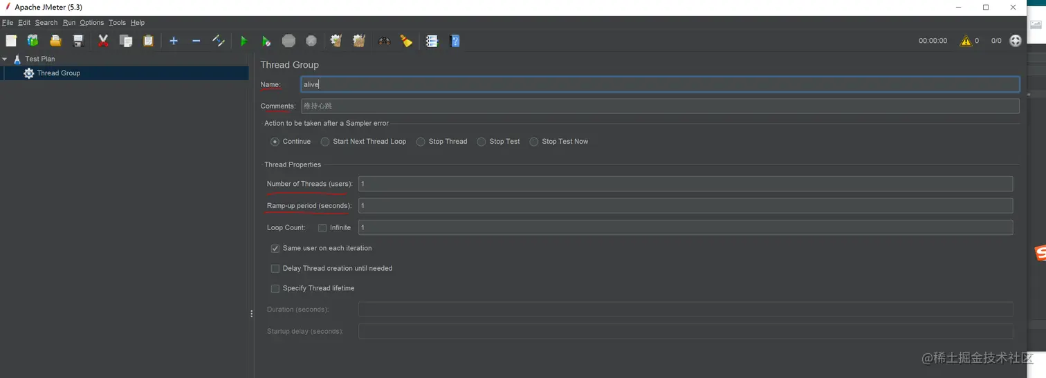 每秒启动的线程数 = 线程数50/5 = 10。loop count循环次数