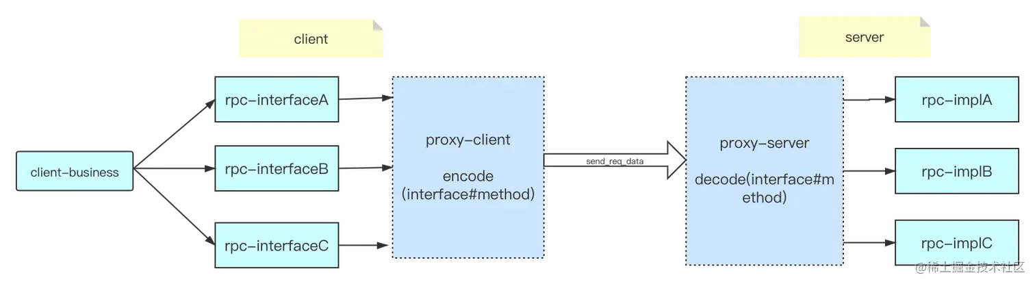- 服务调用方必须有通过Proxy创建出对应的proxy*【rpc接口实现类代理】 对象的过程;因为用户代码需要显式调用接口方法