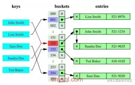 哈希索引就是采用一定的哈希算法,把键值换算成新的哈希值,检索时不需要类似B+树那样从根节点到叶子节点逐级查找,只需一次哈希算法即可,是无序的,如下图所示: