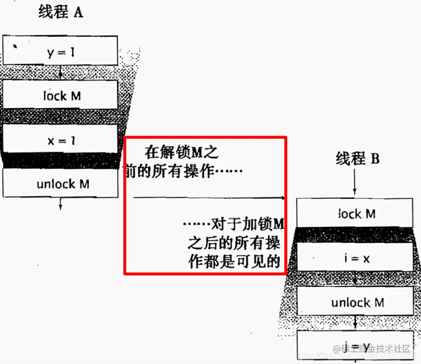 这个结果不仅仅是保证了其i相加时候的原子性. 也说明保证了其可见性. 否则一个线程加完了之后, 另外一个线程没有获取i的最新的值的话, 也会导致相加的结果变少. - synchronized 不仅仅让被保护的代码安全, 还会保证对synchronized 修饰的代码执行完毕之后, 下一个synchronized 进入之前, 整个synchronized 保护的代码块,都会被之后执行的代码看得到. 并且synchronized 之前的所有的代码也会被看到 . 如下面这幅图, 线程B拿到锁之后, 对于线程A的所有的操作都是可见的. 这是一个连带效应.